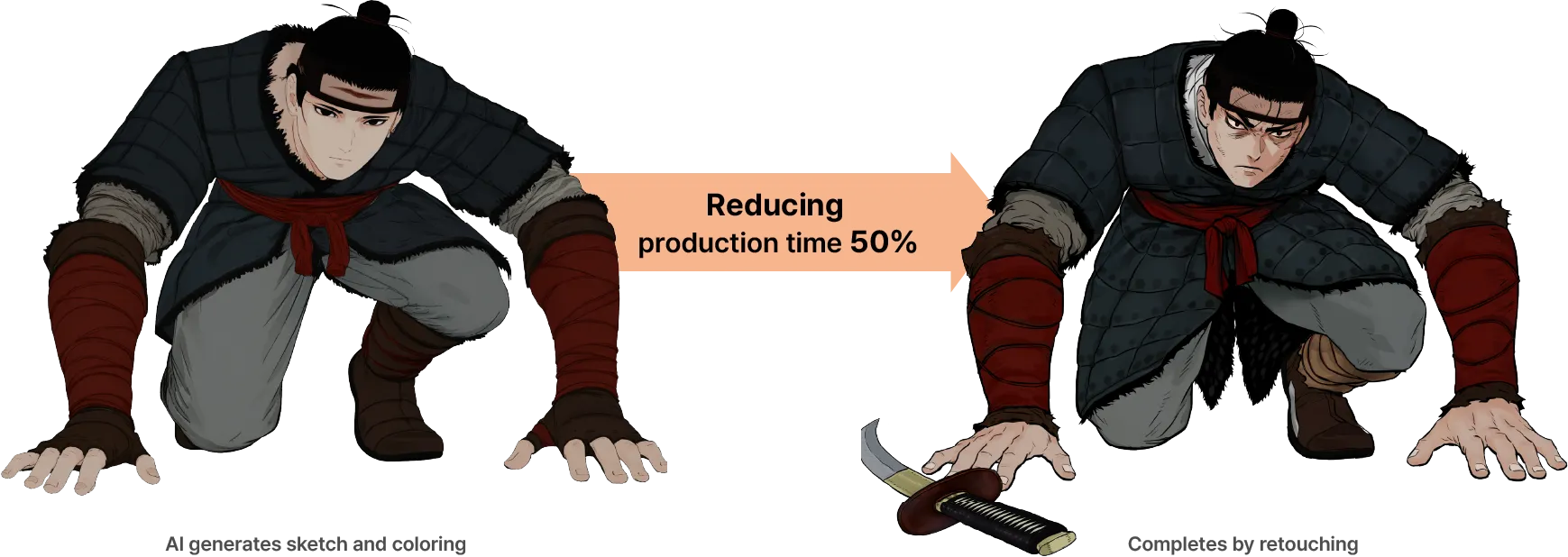 S-cut animation production time reduced from 180 to 90 minutes using our AI generation and retouching.