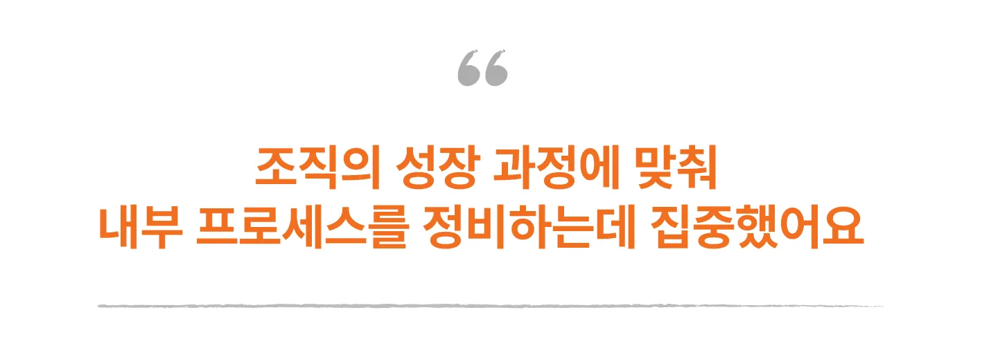 그래서 각 부서가 자발적이고 독립적으로 움질일 수 있게끔 개별 조직에 맞는 미션과 가이드라인을 마련하는 작업을 진행했어요. 필요한 전략적 방향과 비전, 목표 뿐만 아니라 각 부서가 해야 할 로드맵을 정리하며 가이드를 제공하고자 했어요. 지금 돌아보니, 이러한 체계가 어느 정도 자리 잡아가고 있다는 생각이 드네요. PM팀이 적극적으로 협조해준 덕분입니다.