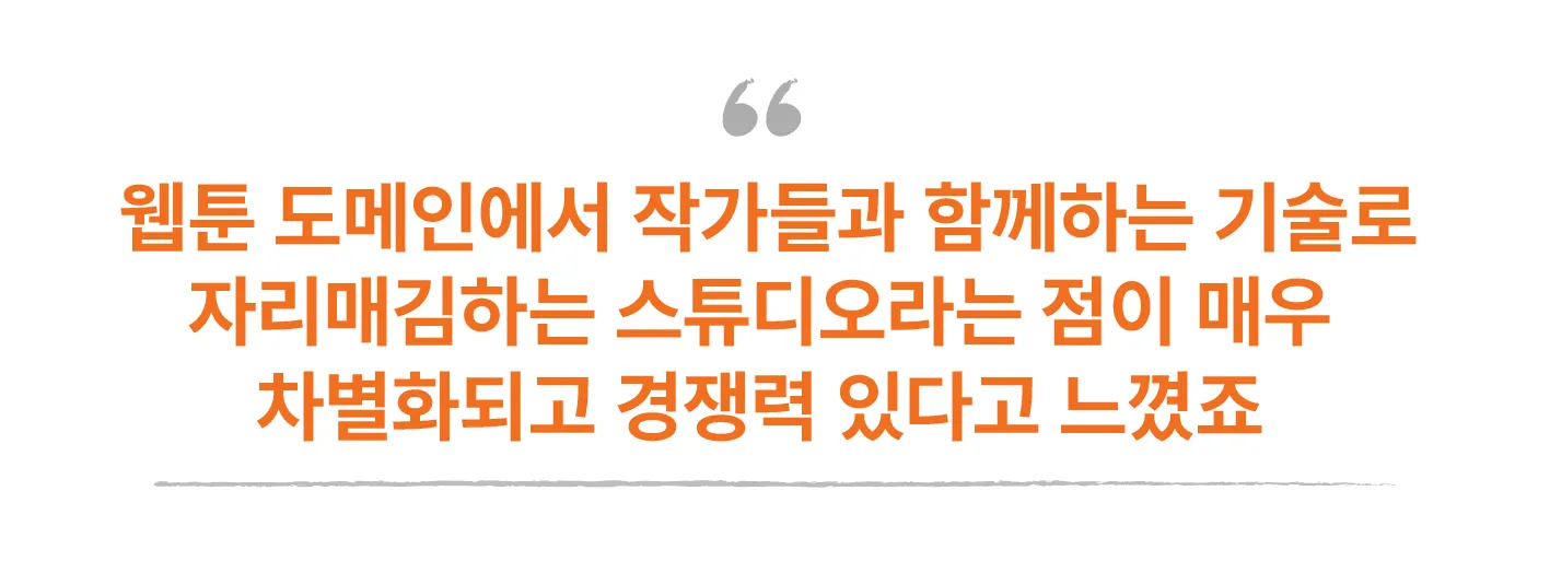나아가 웹툰 그 이상의 경험을 준 회사로 성장하지 않을까 싶네요. 웹툰 뿐만 아니라, AI를 활용해 더 다양한 미디어로 확장하고, 이를 통해 또 다른 경험을 제공한다면 우리가 전달할 수 있는 경험의 폭이 매우 넓어질 거라고 생각해요.