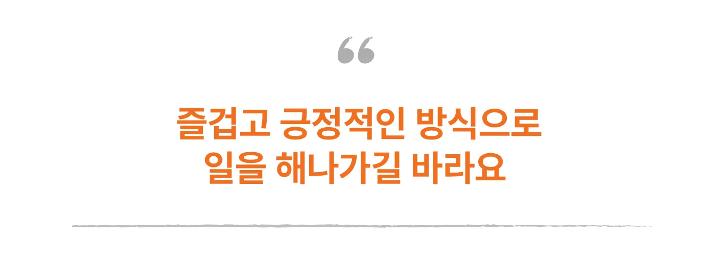 우리 회사에 합류하게 될 분들은 저보다 훨씬 더 멋진 목표와 긍정적인 마인드셋을 가지셨을 거라고 생각해요. 그 분들로부터 많이 배우고, 저 또한 이곳에서 필요한 인재로 함께 성장할 수 있으면 해요.