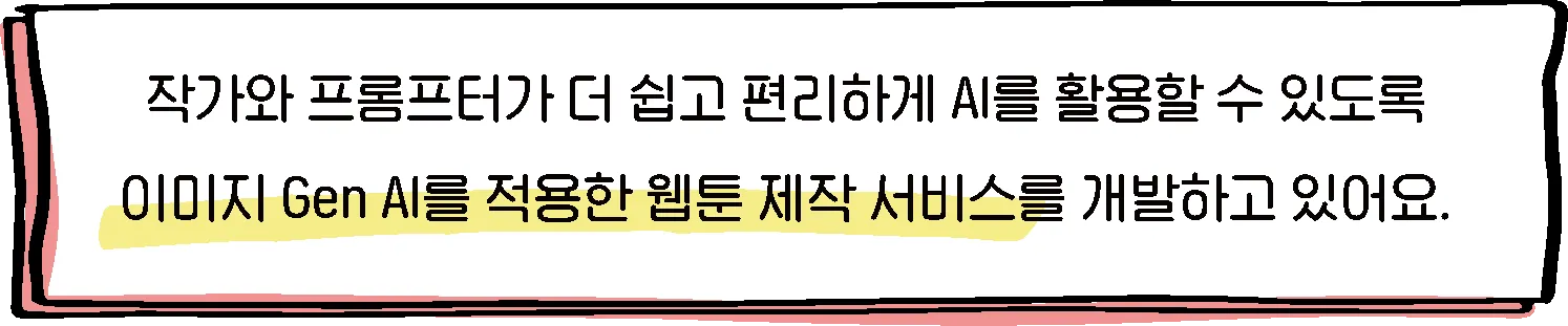 복잡한 환경 설정을 걷어내고, 웹툰 프롬프터가 클릭 몇 번으로 최신 Gen AI 기술을 활용할 수 있게 기술적 환경을 제공했을 때, 그들이 "이거 정말 편해요" 라고 말해주는 순간에 추상적인 기술이 구체적인 경험으로 치환되는 것을 확인하며 존재 가치를 느끼죠.