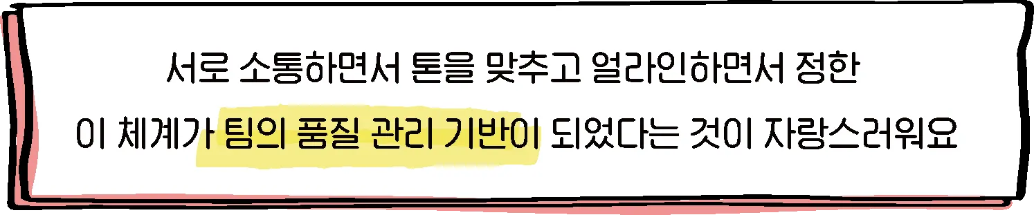 팀 내부에서 만든 가이드만 보고 바로 업무를 수행할 수 있게끔 [체계와 용어를 통일한 점] 이 가장 뿌듯해요. 더 큰 목표를 위한 튼튼한 기초체력을 만든 느낌이에요. 현재 가이드는 2.0이라고 해서 우리의 전반적인 프로세스를 모두 아우르는 가이드거든요. 이건 사업 확장을 준비하면서 필수적이게 되었는데, 누구나 할 수 있는 수준으로 만들면서 용어 통일과 체크리스트, 지침들을 구분해서 정립한 과정이었어요. 서로의 업무에 대한 피드백 조차도 오고 가는 스트레스로 끝나는게 아니라 이걸 어떻게 해석해서 가이드를 만들지 접근하게 되기도 했고요.